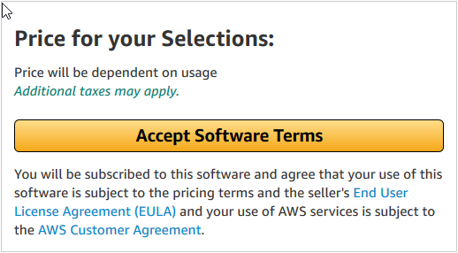 7. Click on the Accept Terms button, if it is present in the top right hand corner of the web page. If it is not present, then your AWS account is already subscribed to the image and you may move to the next step directly.
