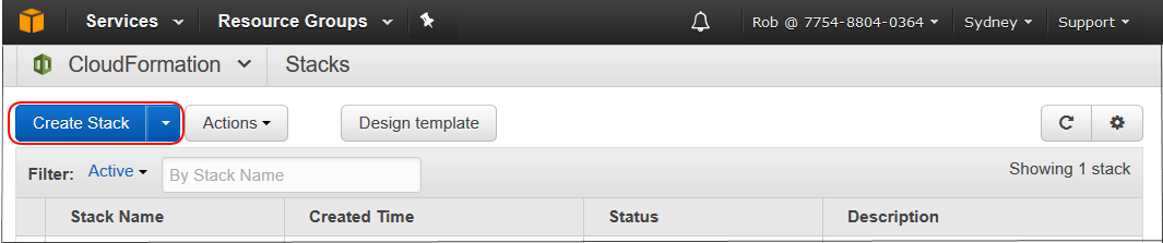 1. In the AWS Console CloudFormation window, select Create Stack or Create New Stack. Create New Stack is only displayed if you do not currently have any stacks.