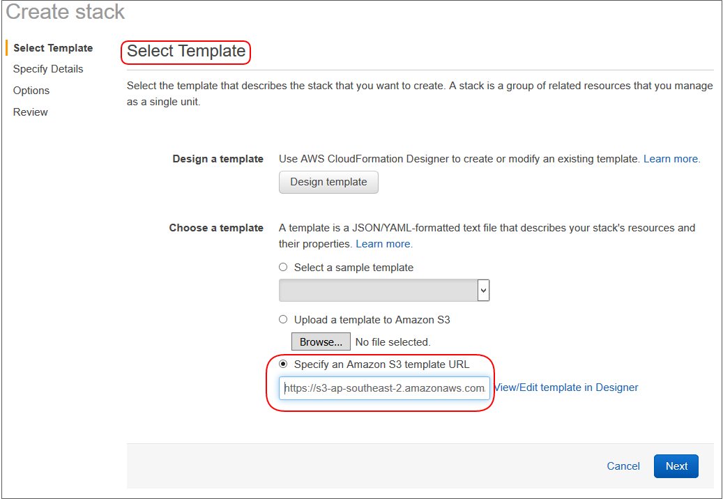 2. Select Specify an Amazon S3 template URL, and then paste in the template URL that you have saved: