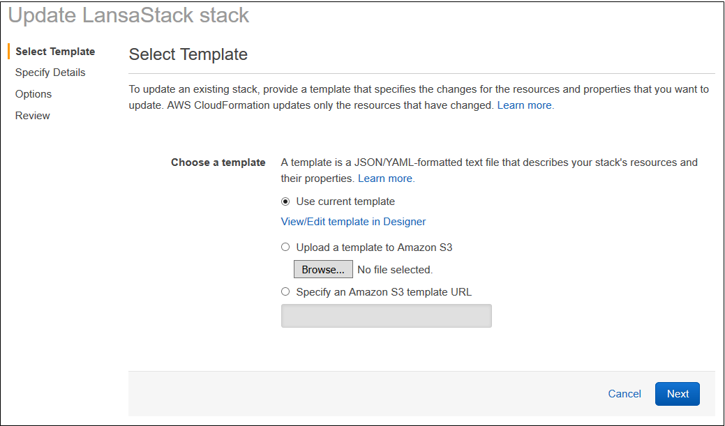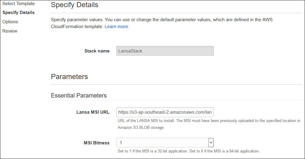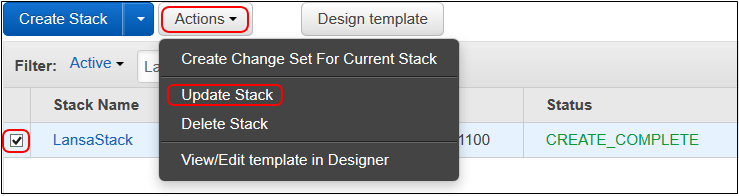 1. In the AWS Console CloudFormation window, you will see three stacks listed. Click the stack that bears just the name of the stack which you created in exercise CTE040. E.g. LansaStack.