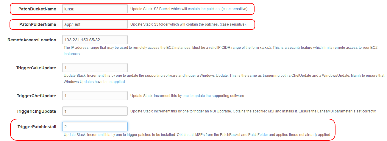 2. Scroll down the list of parameters to the PatchBucketName, PatchFolderName and TriggerPatchInstall parameters.